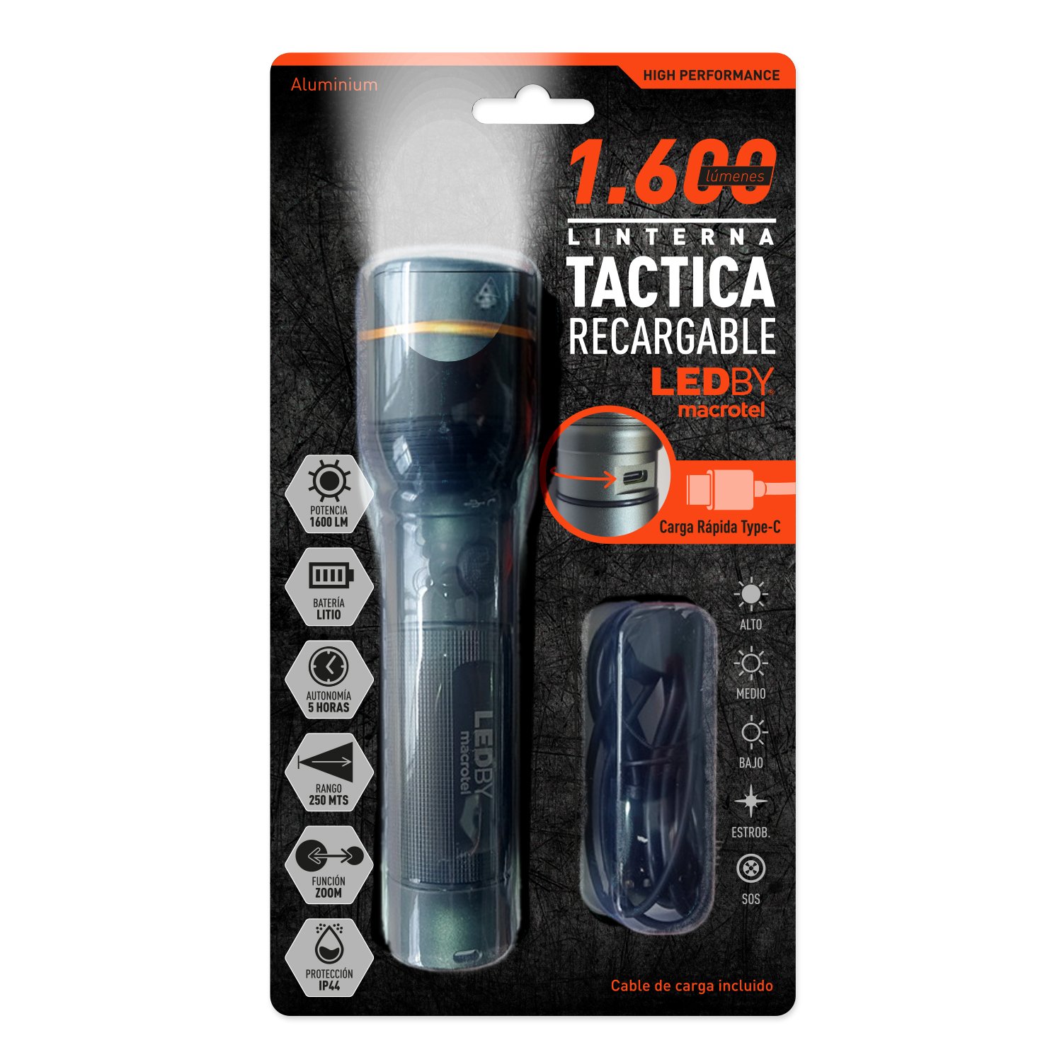 LINTERNA LED RECARGABLE USB TIPOC 1600LM